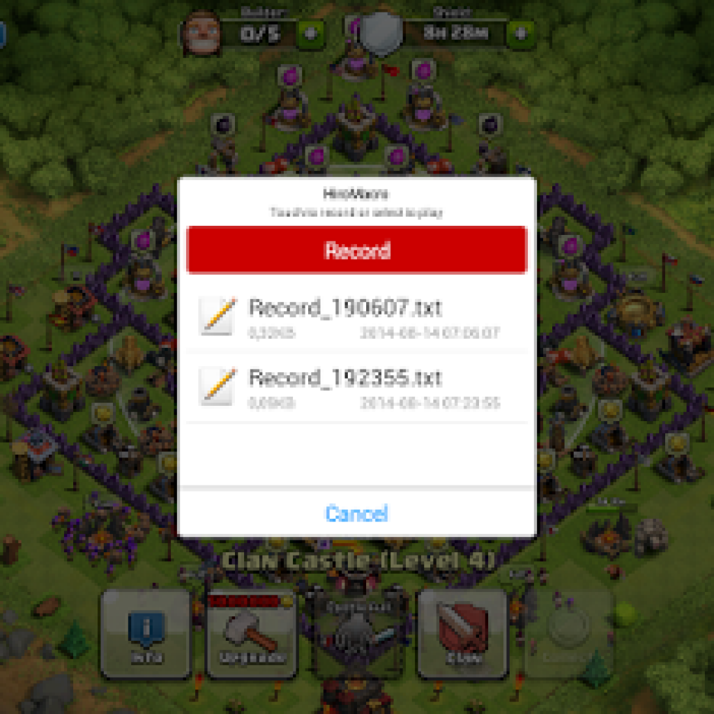 • Setelah HiroMacro-nya berjalan, buka Clash of Clans anda. Tekan Volume Down untuk memunculkan kembali HiroMacro-nya, kemudian klik Record untuk mulai merekam sentuhan anda.